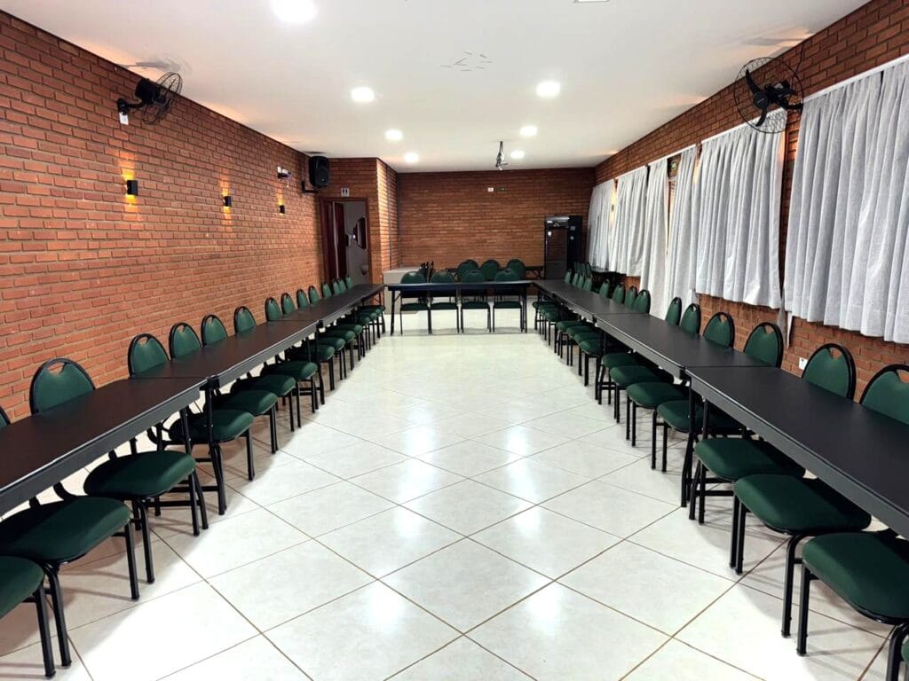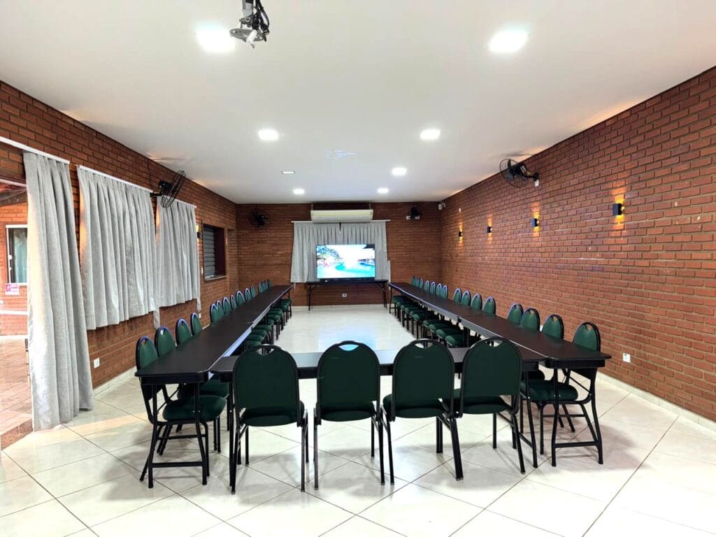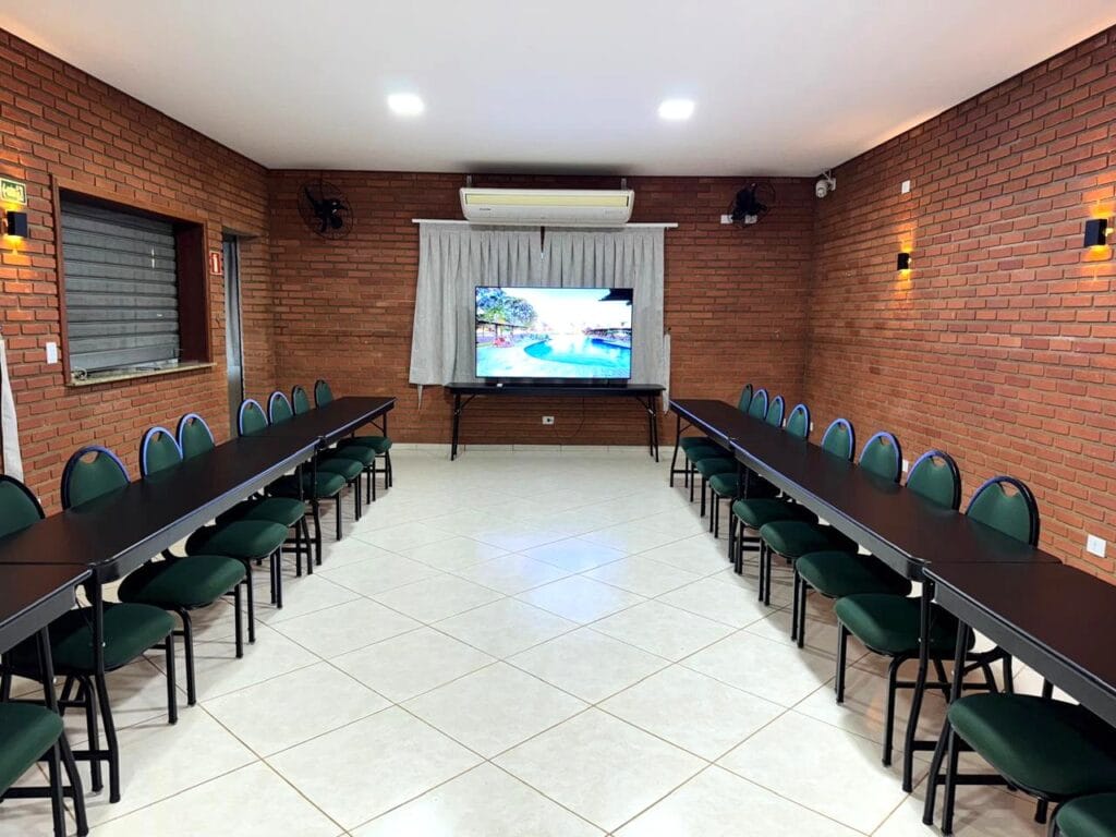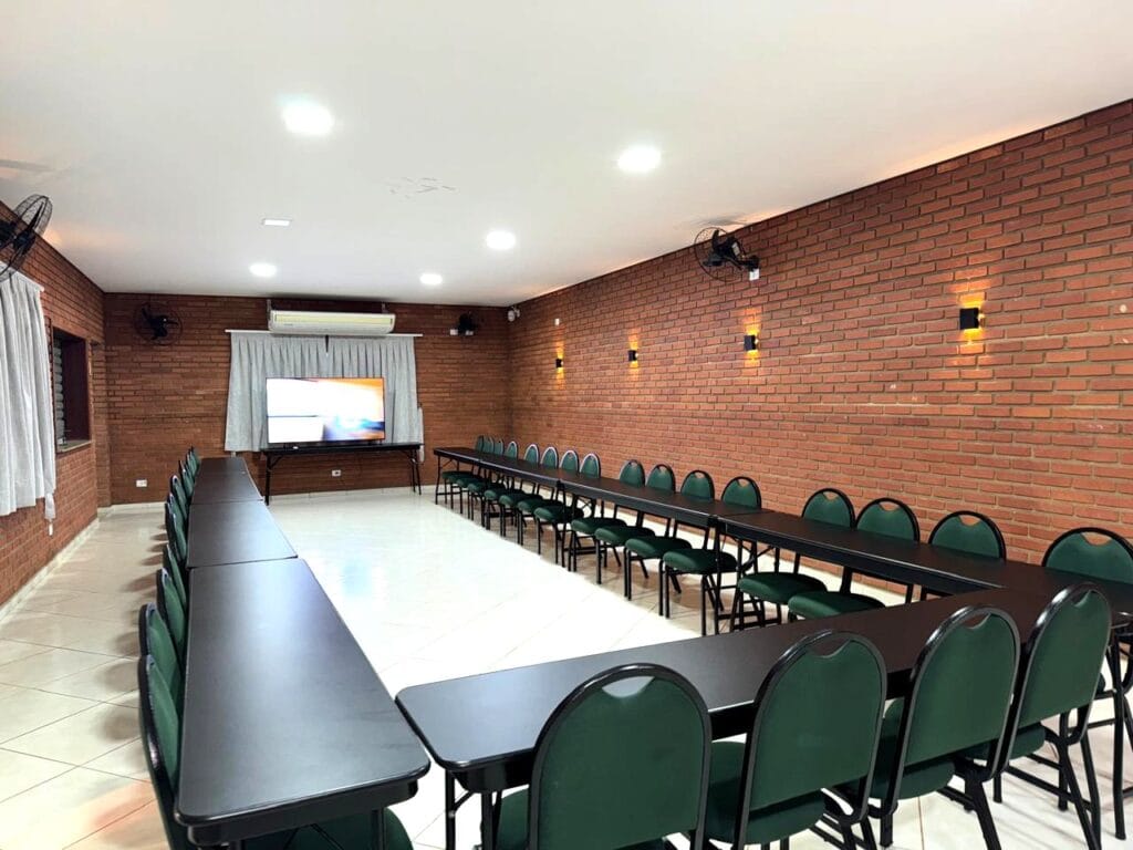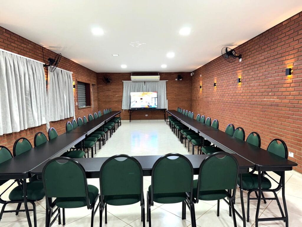 Nossa sala de eventos foi planejada para atender com qualidade grupos que valorizam organização e boa estrutura. Com capacidade para até 50 pessoas, o espaço conta com ar-condicionado, mobiliário versátil e confortável, além de sistema de som e televisão para apresentações.