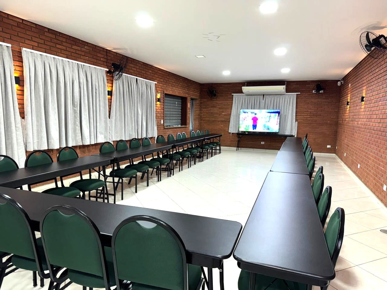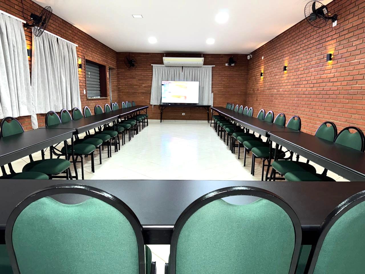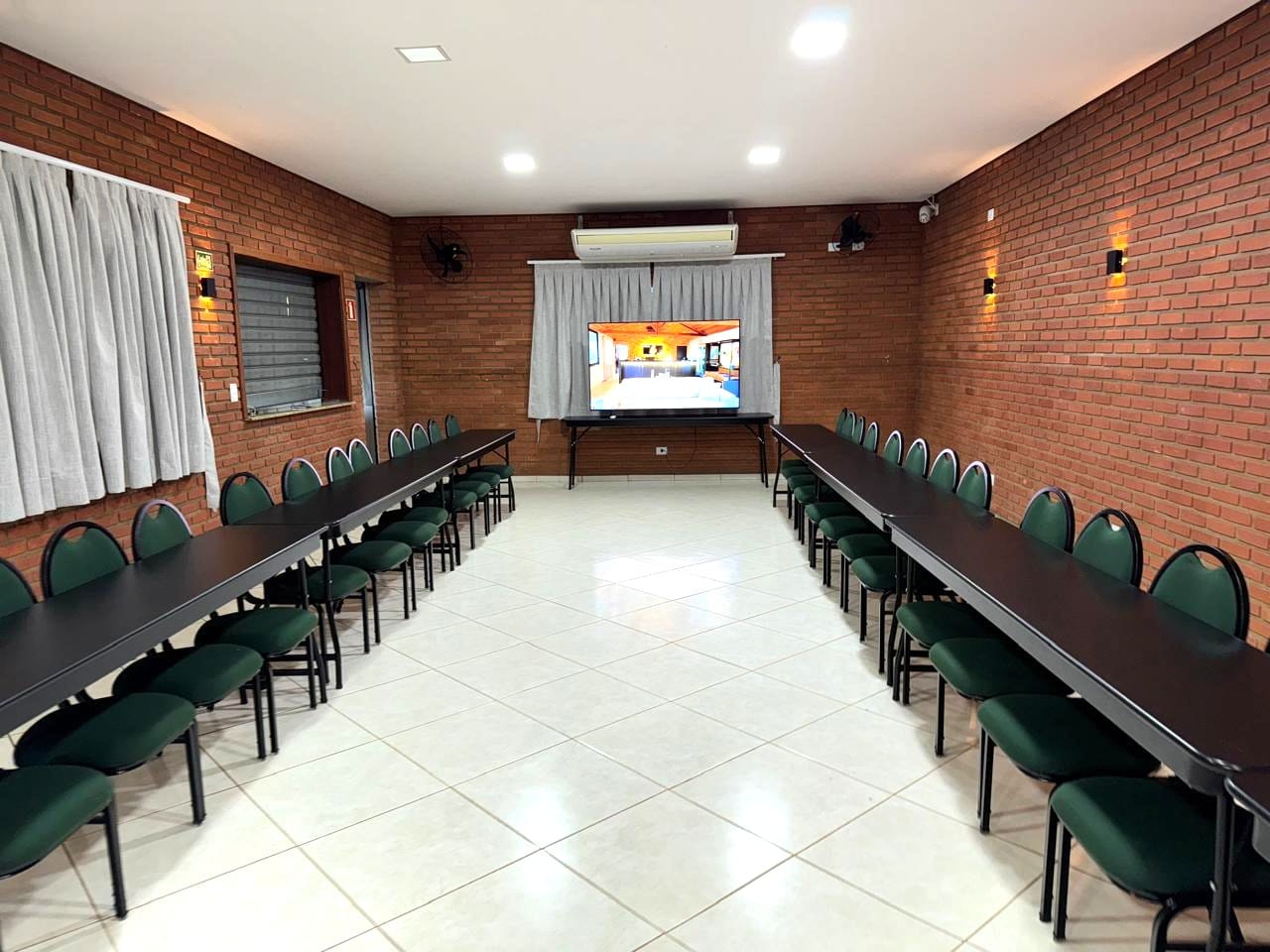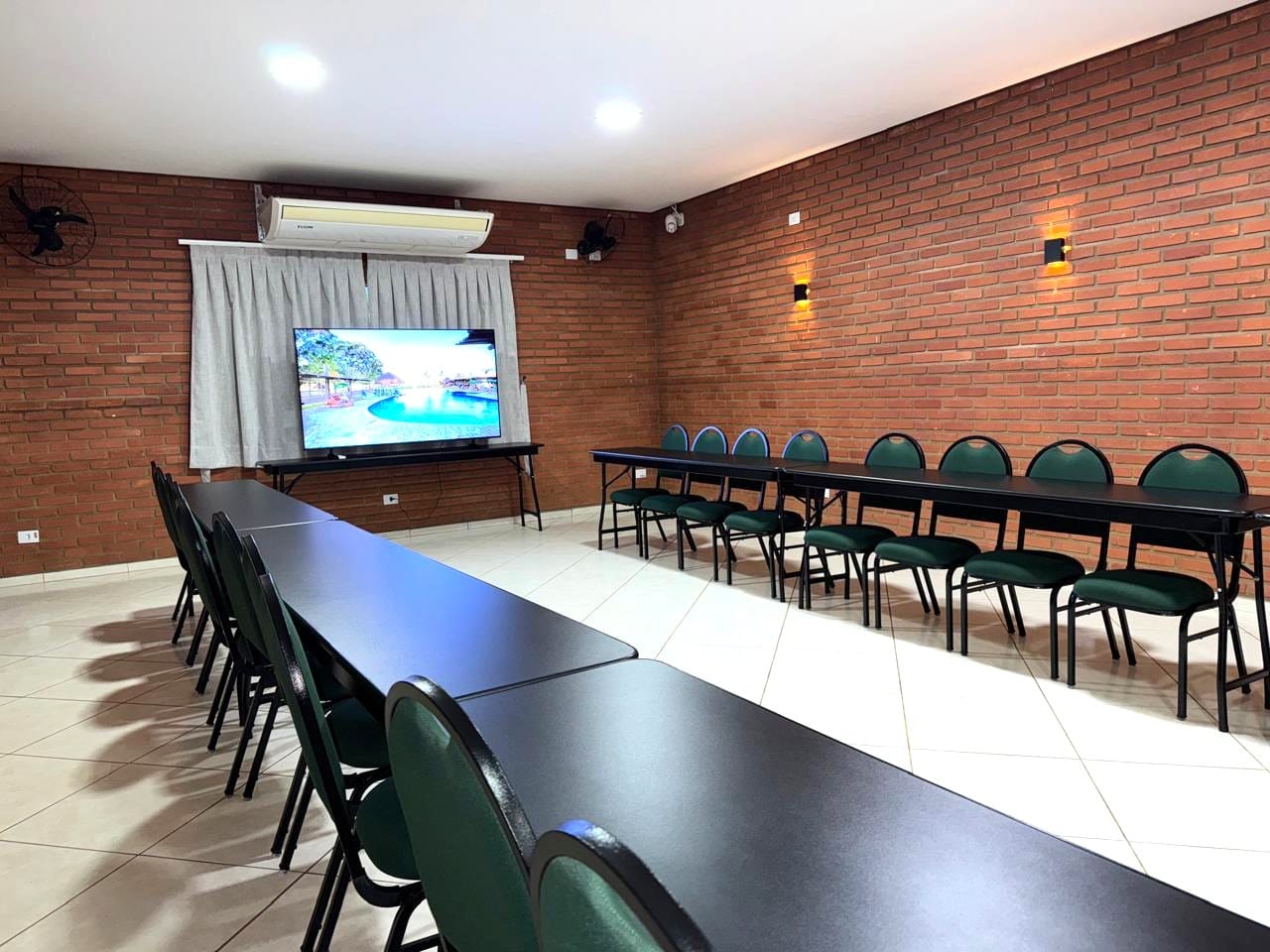 Nossa sala de eventos foi planejada para atender com qualidade grupos que valorizam organização e boa estrutura. Com capacidade para até 50 pessoas, o espaço conta com ar-condicionado, mobiliário versátil e confortável, além de sistema de som e televisão para apresentações.