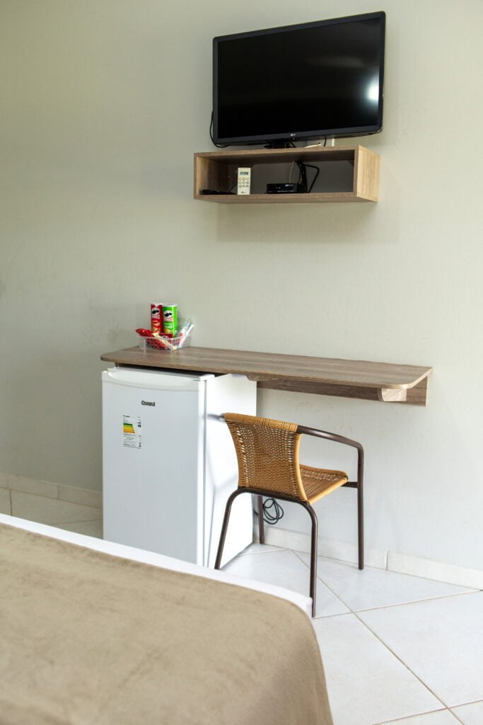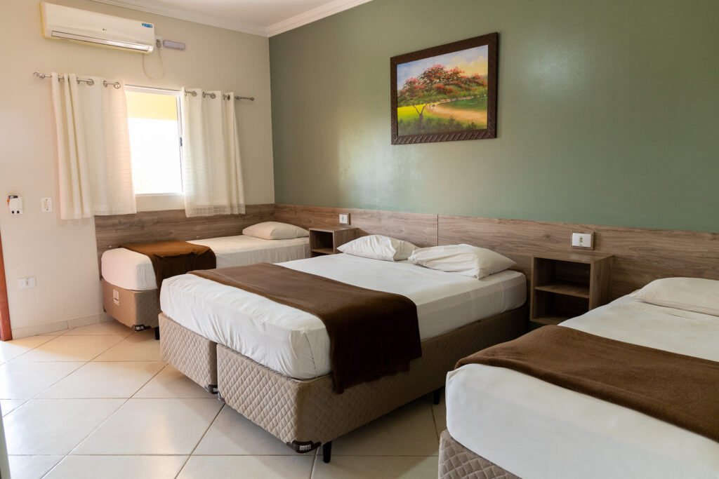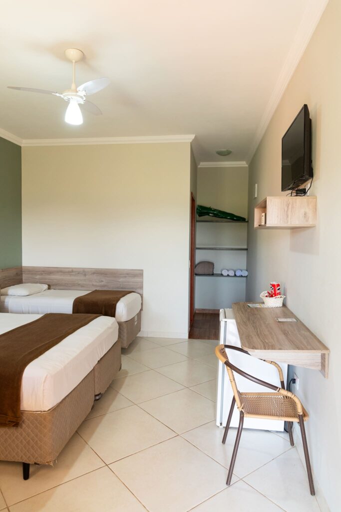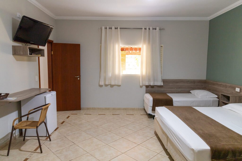 Acomoda perfeitamente casal com dois filhos ou quatro adultos. Acomodação de 20m² com uma cama de casal e duas de solteiro. Possui ar condicionado, frigobar, TV LCD com canais a cabo, conexão Wi-Fi por todo o hotel como cortesia, banheiro privativo e roupas de cama e banho inclusas. Como não possui varanda com rede e vaga para o carro é o melhor custo x benefício disponível. Check-in 16h e check-out 14h.