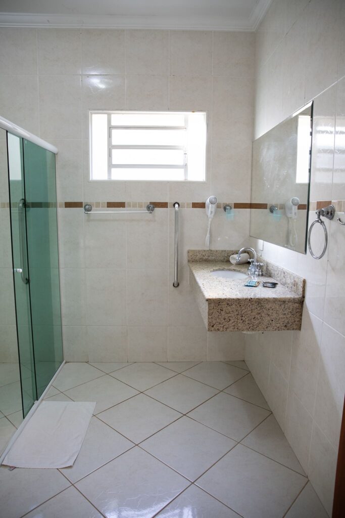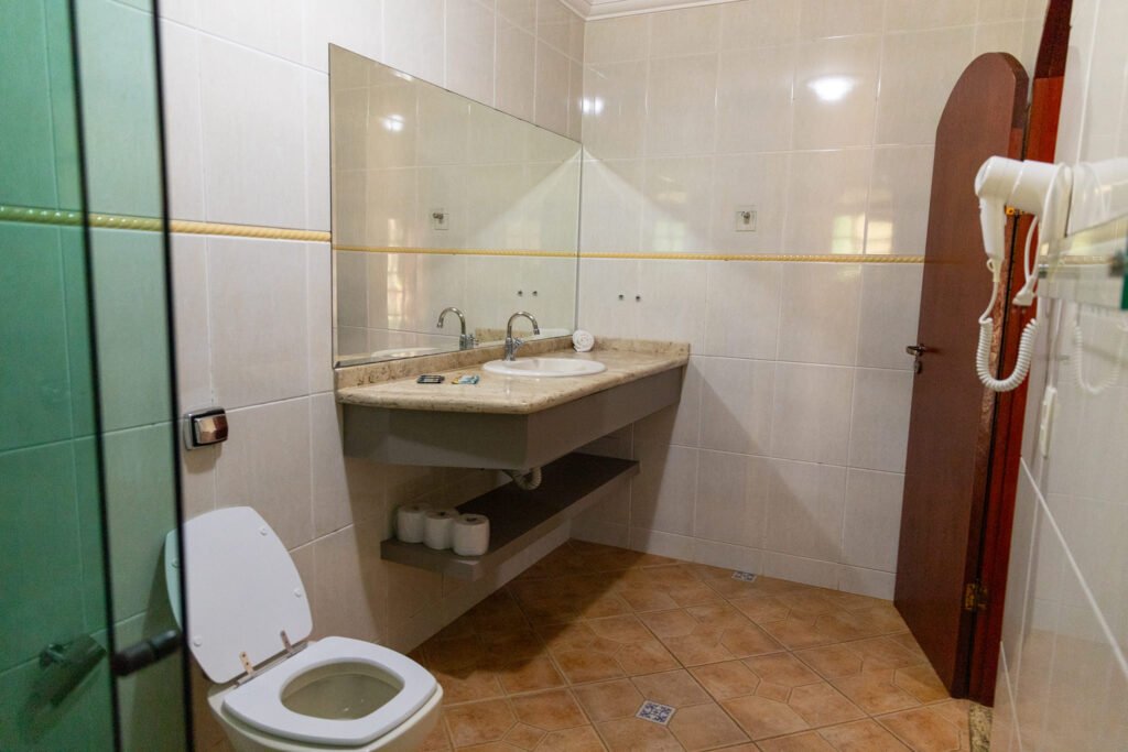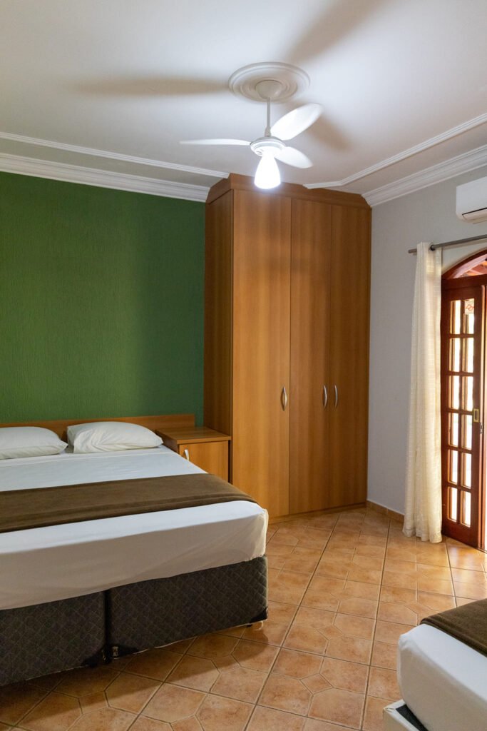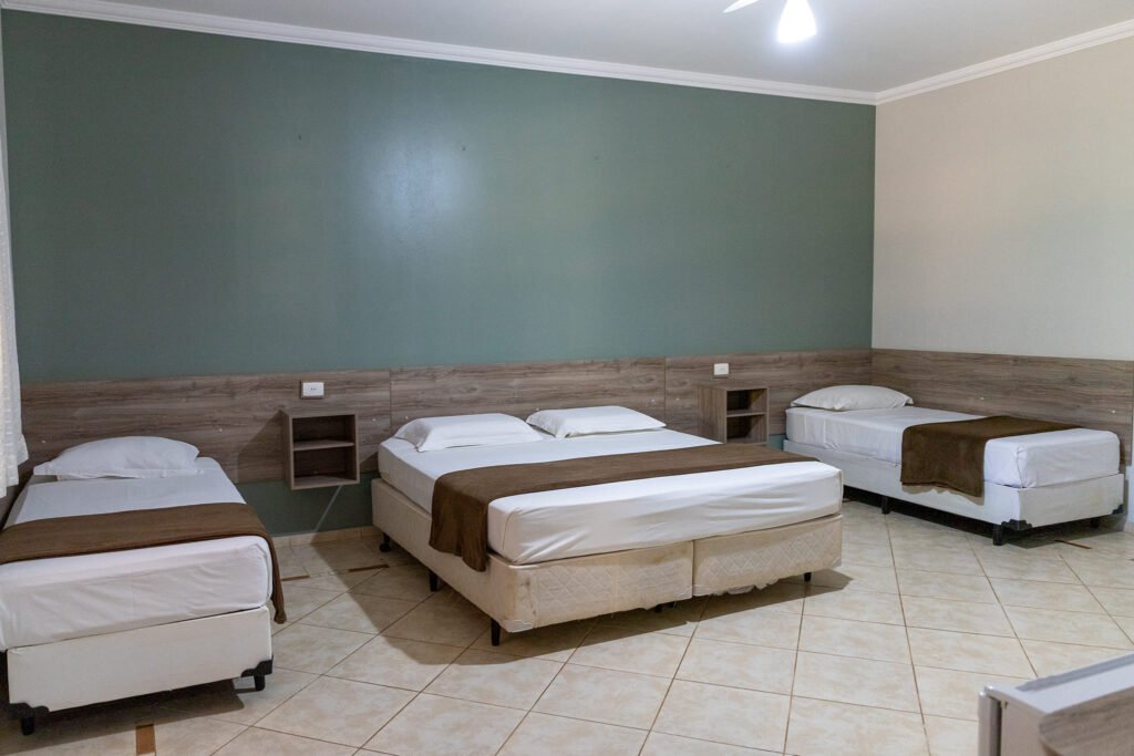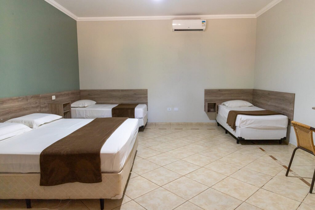 A família é grande? Sem problemas, nosso quarto família possui  40m² para no mínimo 5 e máximo 6 pessoas, com ar condicionado, frigobar, TV LCD com canais a cabo, conexão Wi-Fi por todo o hotel como cortesia, varanda independente com vaga para o carro e rede para descanso, banheiro privativo e roupas de cama e banho inclusas. As camas são no mesmo ambiente. Quarto com um banheiro. (Adaptado para cadeirantes). Check-in 16h e check-out 14h.